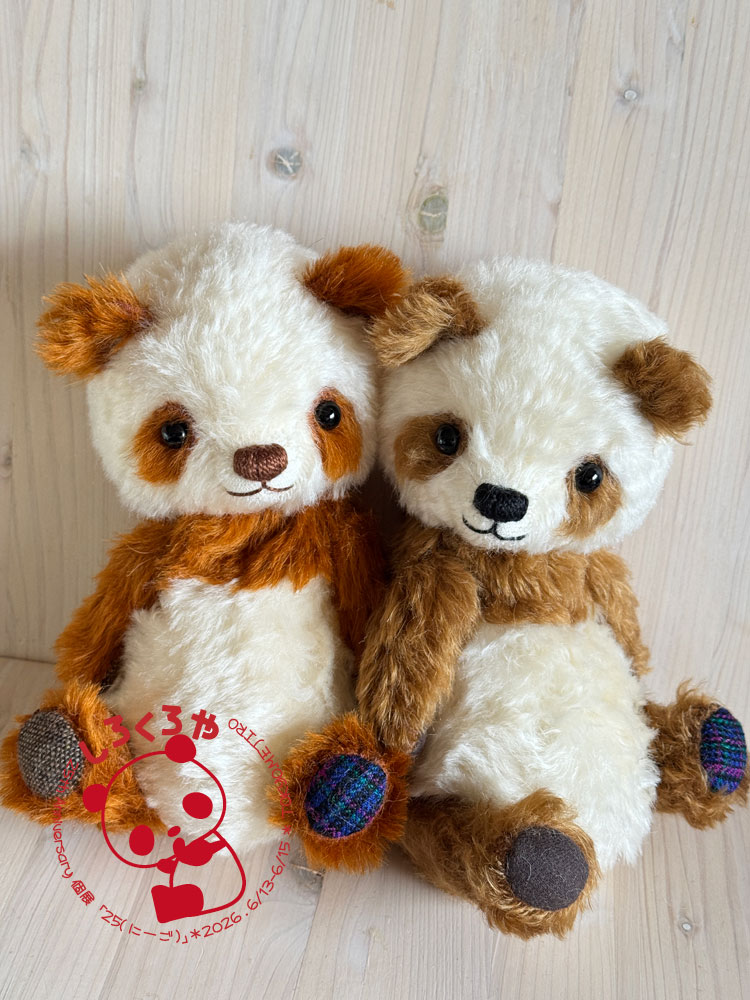 昨日完成したのは、定番パターンのひとつ、25センチのパンダちゃんたちです。どちらもきれいな色で、かわいくできて満足です。足の裏の模様をお揃いにしました。